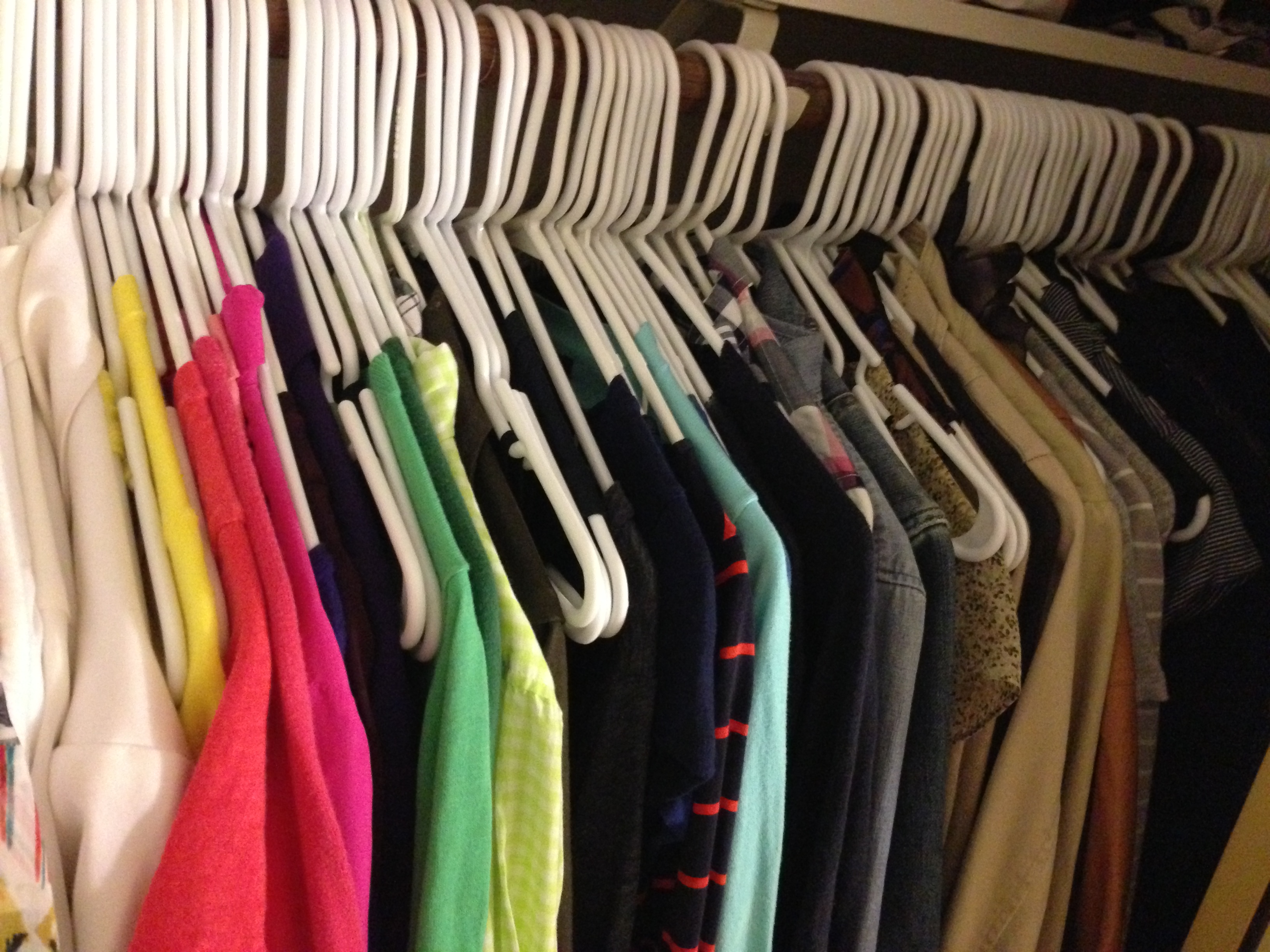 You know how I’ve mentioned in my last few blogs about how busy I’ve been? Well, I’ve been really busy. So, one would think I’d spend this week chillaxing and catching up on TV or my blog or maybe do some wedding planning. Nope. Since I rented the rental car for a week I decided it was necessary we take advantage of that and the remaining few days of spring and take a bunch of stuff to Goodwill. In order to take a bunch of stuff to Goodwill, that would require me to clean out my closets. And, that’s what I did. First, on Tuesday, I decided it was necessary to stop at Home Depot to buy an outdoor storage unit for our patio so that we could take a bunch of stuff out of our spare bedroom closet. Then I removed everything from my closet and proceeded to color coordinate it all.