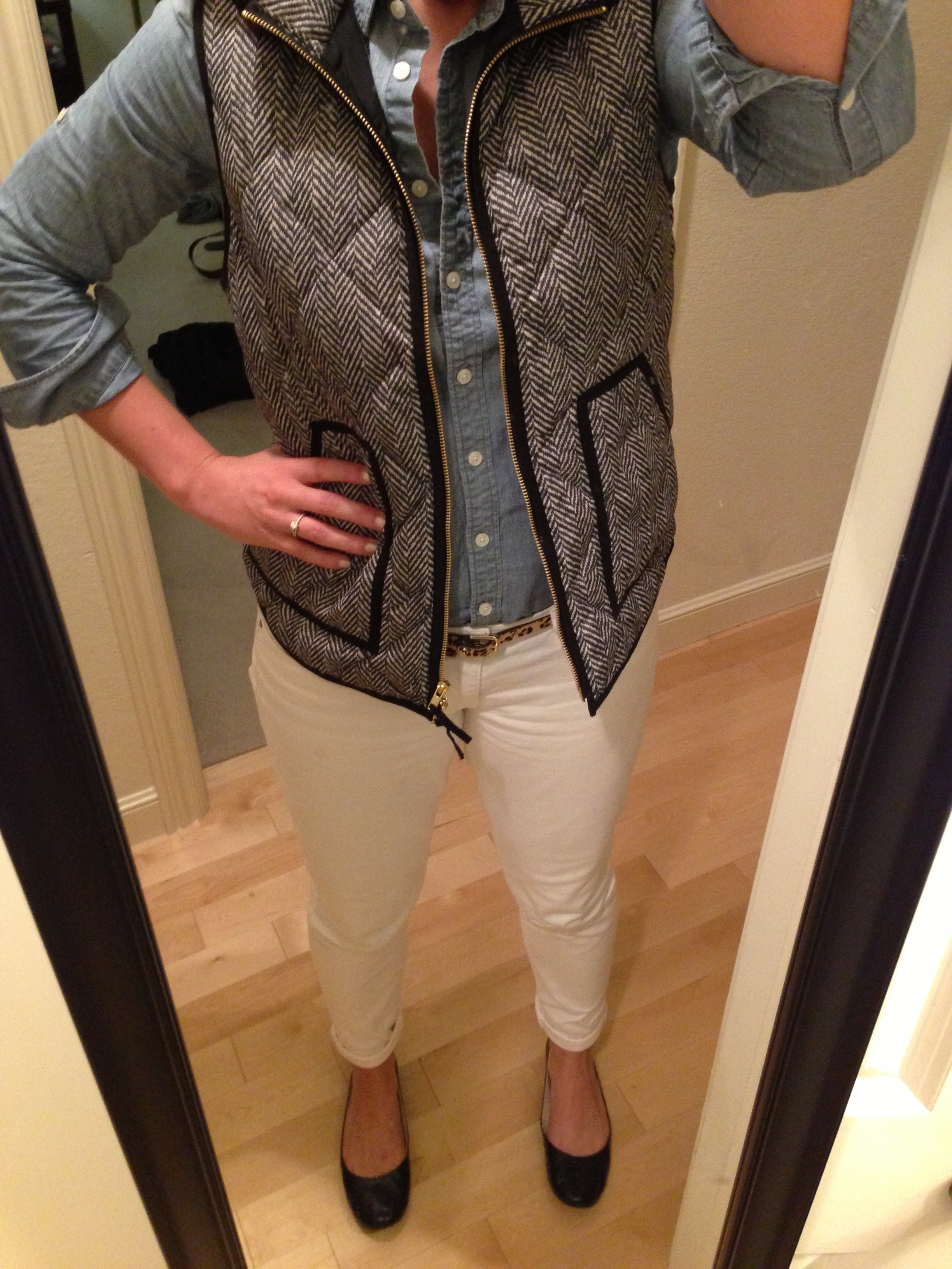 Last night we went to dinner with my friend Dragos and his wife Elena since they were in town visiting from the UK (they’re originally from Romania if the names don’t sound very British). My new favorite purchase is a herringbone vest that I’ve seen all over Pinterest for the last year, but haven’t been able to get my hands on. Well, as fate would have it, we went to the outlet malls in Napa on Saturday night and there was one vest in the J. Crew store and it was in my size. FATE. Obviously I had to wear it out to dinner last night. Dragos and Elena didn’t comment on it, but I’m sure they loved it. Who wouldn’t?