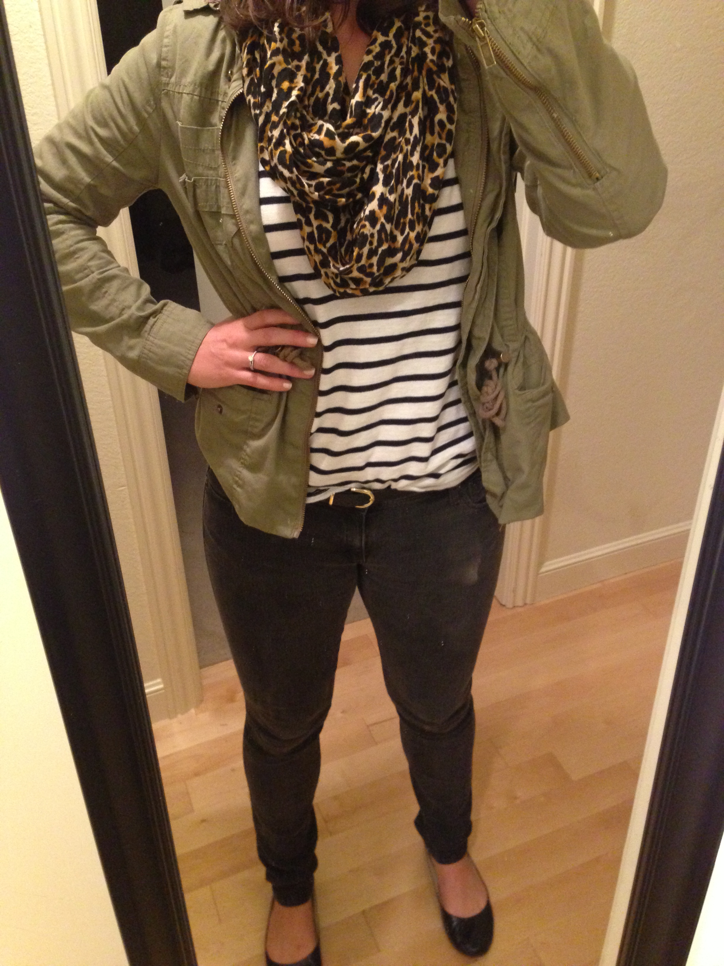 I’m not a big fan of wearing too many trends, but this inspiration seemed to pull it off well, so I decided to try all three things I love right now: leopard, army jackets, and stripes.