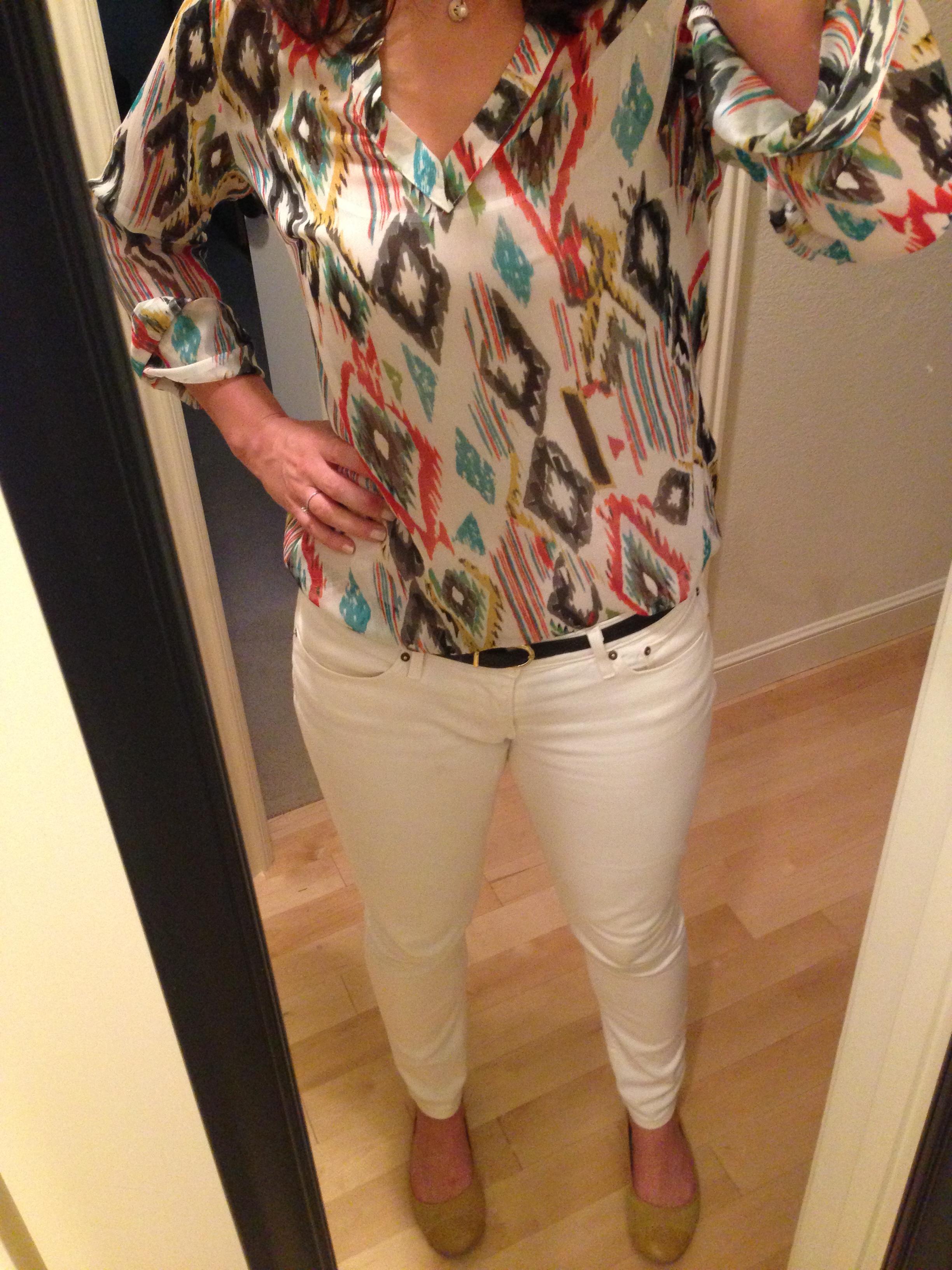 Necklace: Banana Republic Factory (this season); Shirt: Banana Republic; Belt: J. Crew Factory; Jeans: Gap; Shoes: Kenneth Cole (this season)