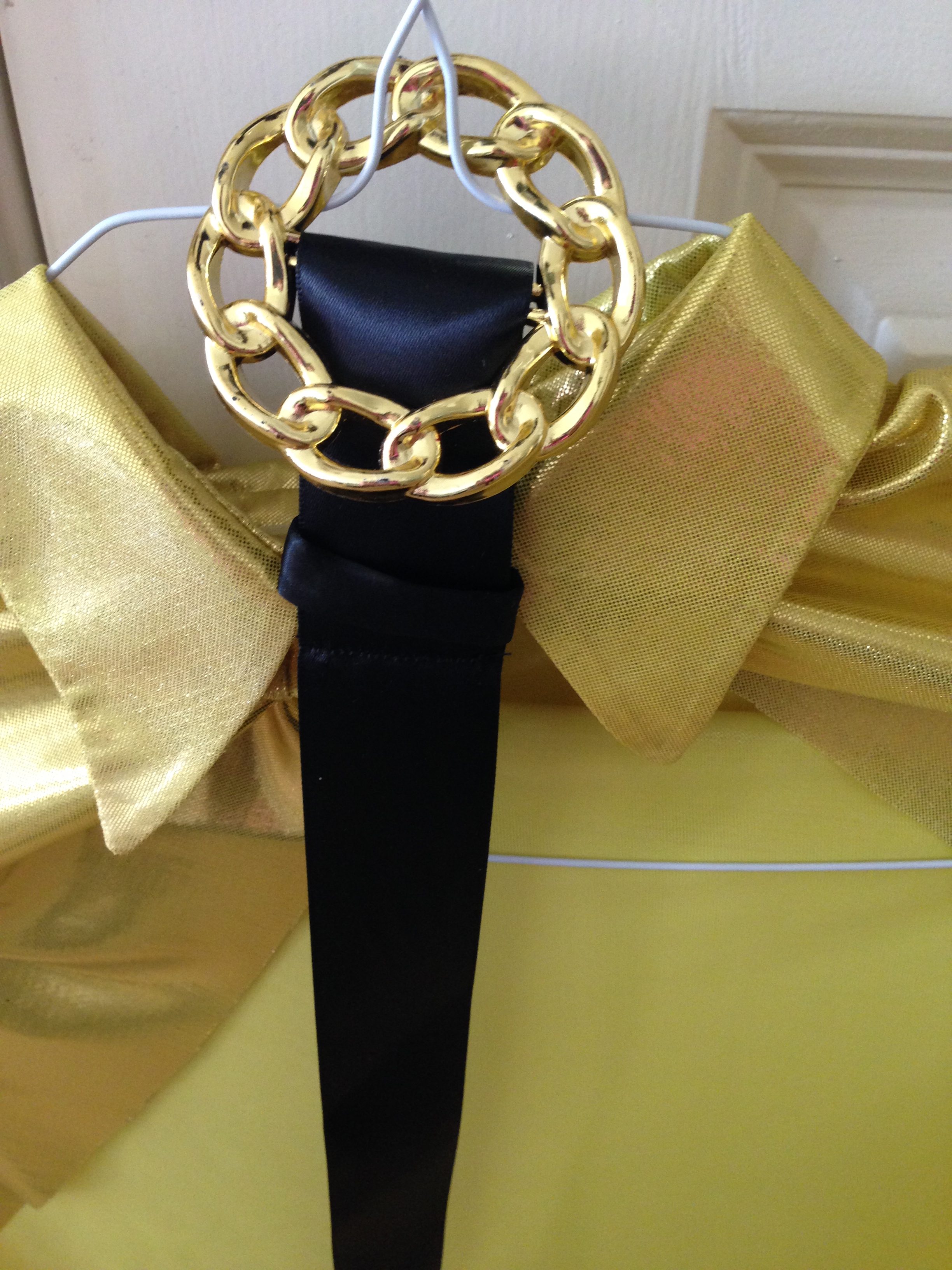 For the belt, I bought a cheap, plastic buckle from the fabric store. I also bought black ribbon that was the same width as the middle of the buckle. The sewed one side of the ribbon to loop it through the buckle. The other end of the ribbon I just sewed back a little seam.