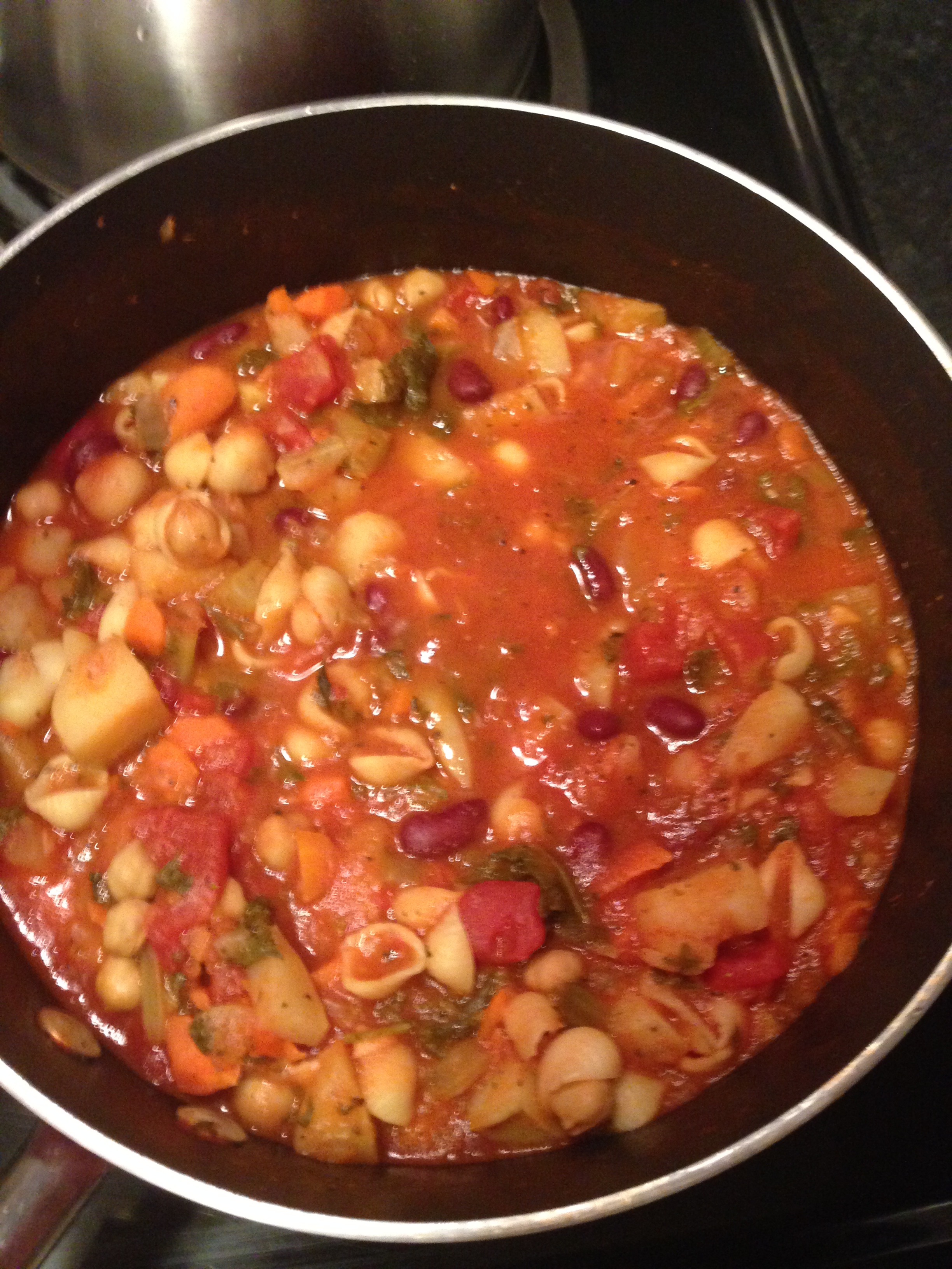 - Add chick peas, kidney beans, kale and pasta. Simmer another 20 minutes. Add salt and pepper.