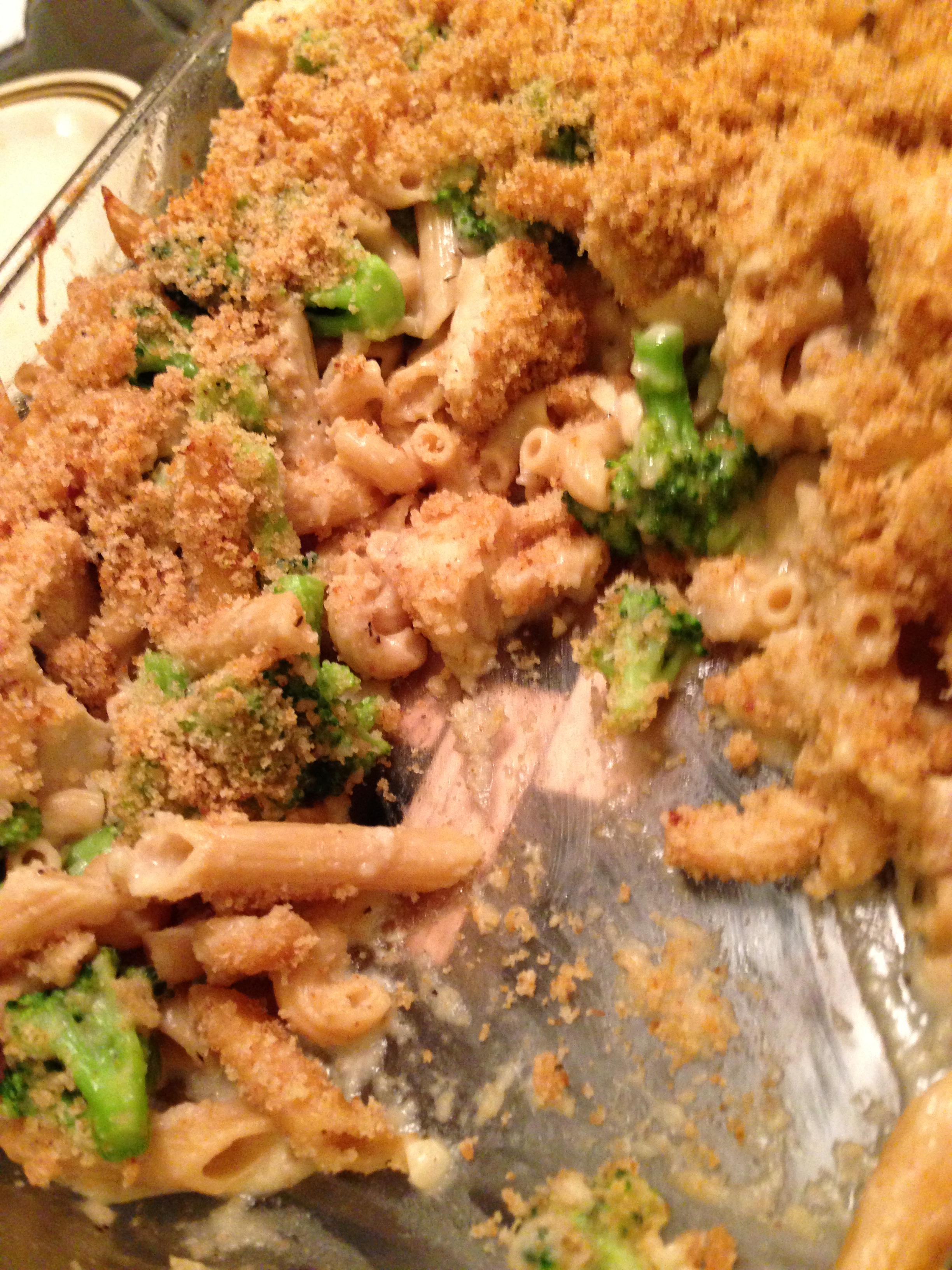 - Add the cooked pasta and broccoli to the sauce; stir to combine. Transfer the pasta mixture to the prepared baking dish and sprinkle with the bread crumb topping. Bake until the casserole is bubbling and the crumbs are lightly browned, about 15 minutes. Serve immediately.