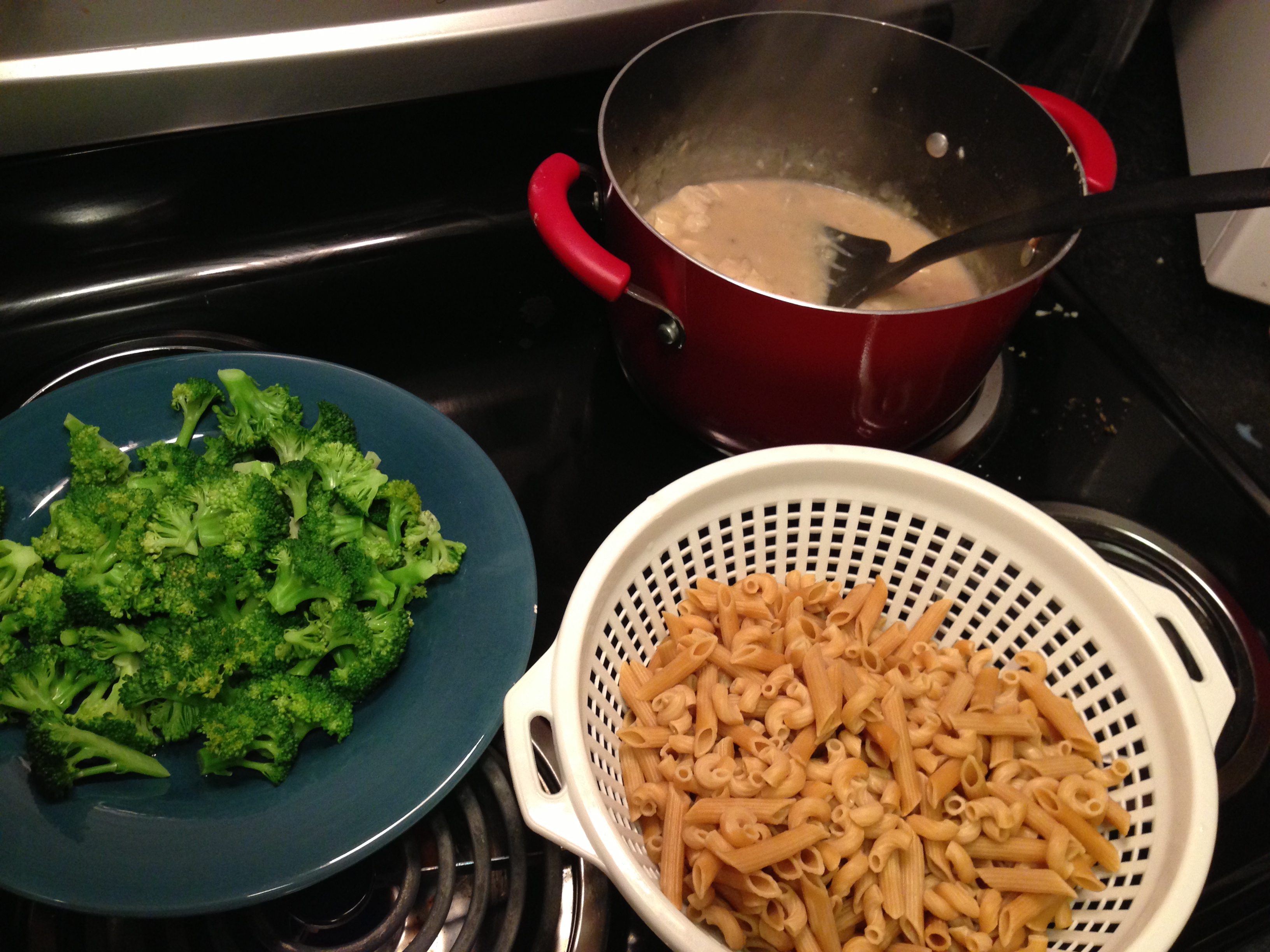 My first mistake in making this dish was the pre-planning (are you noticing a pattern?). I knew we had a box of penne in the pantry, so I didn’t buy any when we went shopping. Shortly after I started I realized we had only a half a box. So, I decided to improvise. We also had a half a box of whole wheat elbow macaroni (and who doesn’t love macaroni) that I decided to dump in with the penne. .3 seconds after dumping it in I realized I cook time on both was rather different. Oh well!