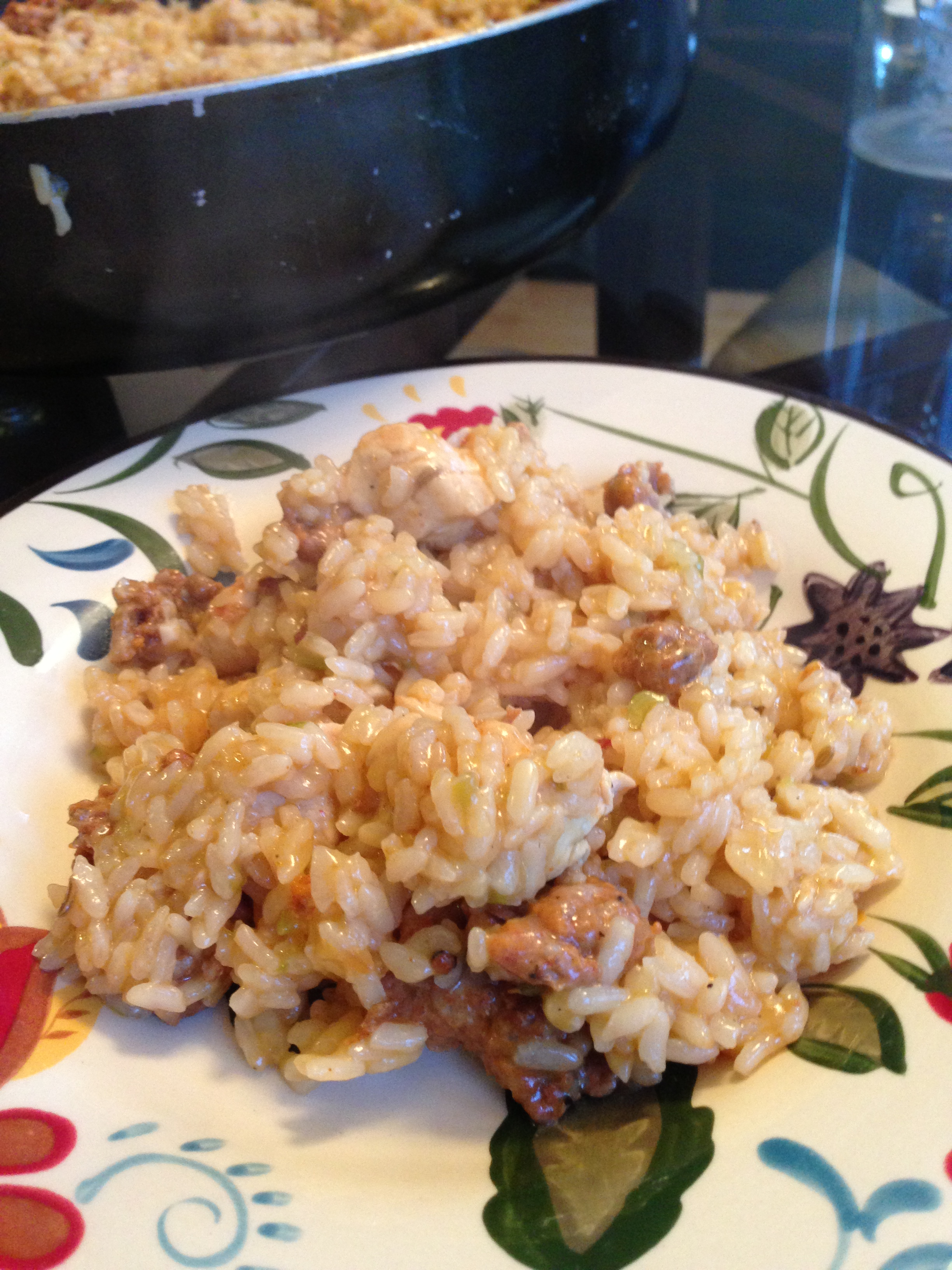 My Knight In Shining Armor had a recipe for jambalaya that he promised me was super simple (I mean, even the recipe has the word easy in it). Well, it wasn’t difficult, but it was definitely more time consuming than I’d anticipated. I chopped up the meat and all the veggies and cooked it. I was starving by the time I realized that it had to sit for 20 minutes simmering. Ugh. When it’s 8:00 pm the last thing I want to do is watch the food simmer. Thankfully the meal was really, really good. It had the perfect amount of hotness. I should mention we subbed some New York hot links for the kielbasa it called for.