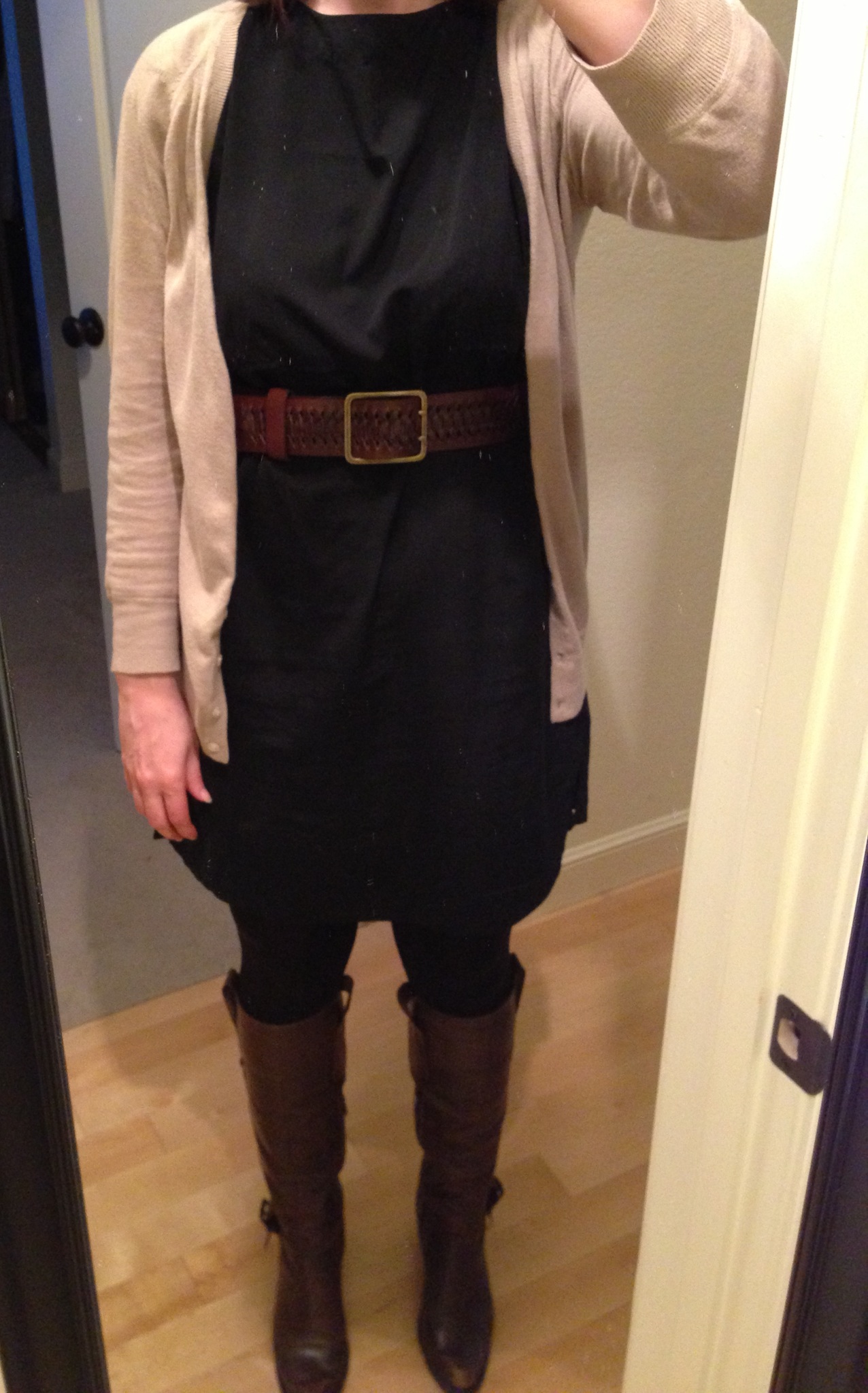 Cardigan: Lands End Canvas; Dress: Old Navy; Belt: Old Navy; Tights: Target; Boots: Aldo