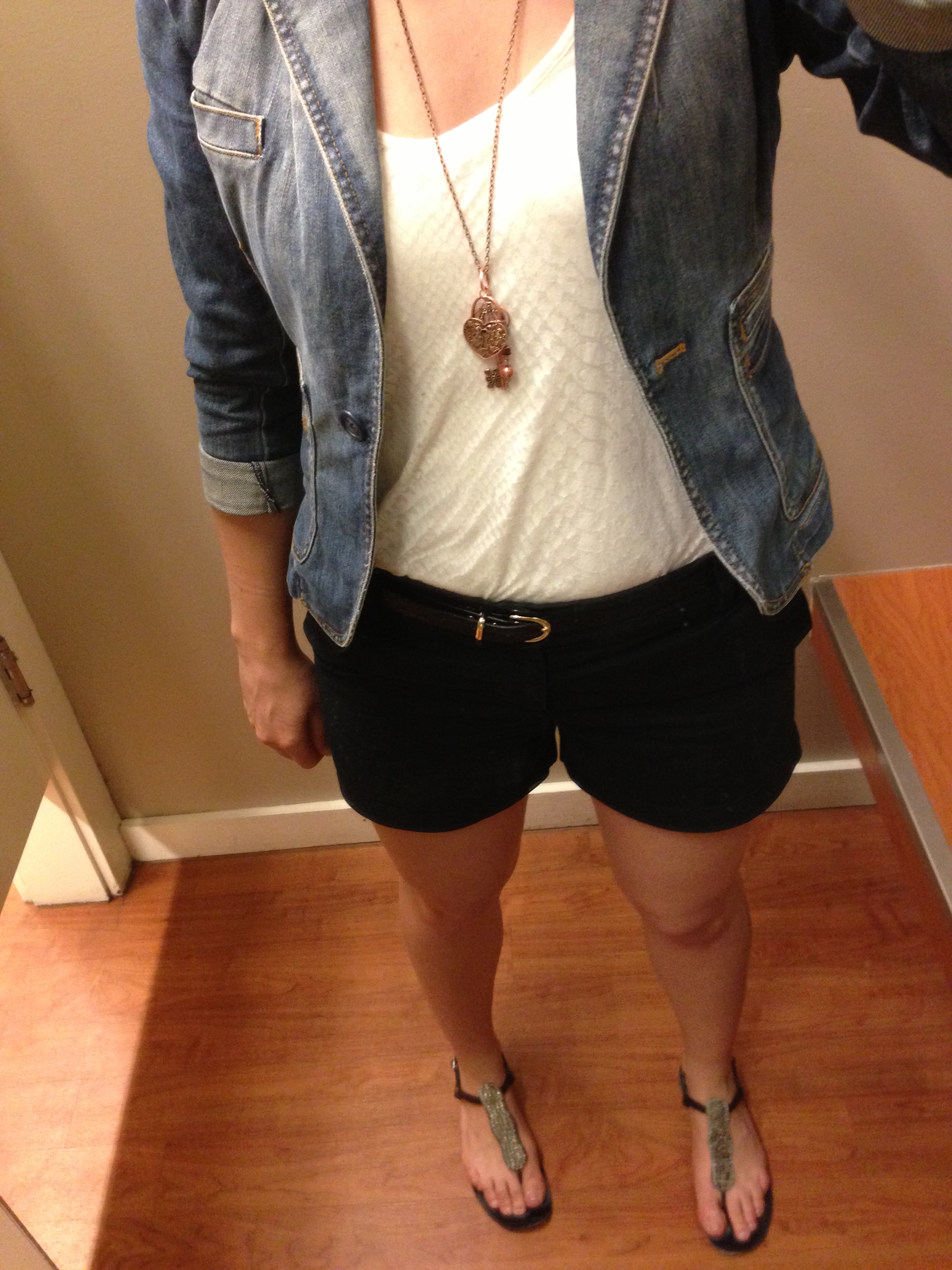Jacket: The Limited; Necklace: Forever 21; Tank: Express (layer over another from Old Navy); Shorts: Loft; Belt: H&M (this season); Sandals: Aldo